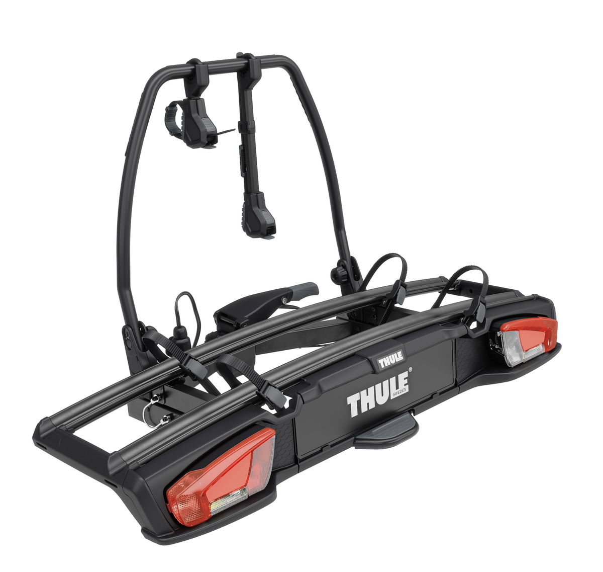 Díky nadstandardní vzdálenosti mezi držáky kol (25 cm) a extra dlouhým hliníkovým žlábkům je montáž kol rychlá a bezpečná, bez vzájemného kontaktu. Inovovaný systém nezávislých ramen s otočnými hlavami a popruhy zajišťuje pevné uchycení jakéhokoli typu rámu, včetně karbonových (s použitím adaptéru Thule Carbon Frame Protector).