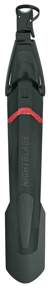 Blatník Nightblade je ideálním řešením pro horská kola, které kombinuje ochranu proti stříkající vodě s vyšší bezpečností díky integrovanému zadnímu světlu. Světlo s dobíjecí baterií lze snadno vyjmout a nabít přes USB. Blatník je vybaven jednoduchým upínacím systémem, který umožňuje montáž na většinu sedlovek, a jeho kloubová konstrukce zajišťuje optimální přizpůsobení na různé typy kol. Je vhodný pro kola velikosti 29" a 27,5+, s maximální šířkou pláště 3,0" a délkou blatníku 620 mm.