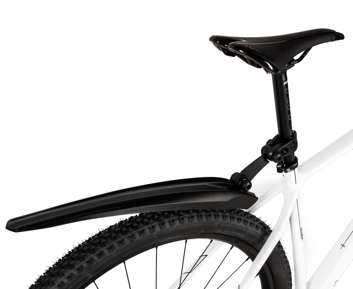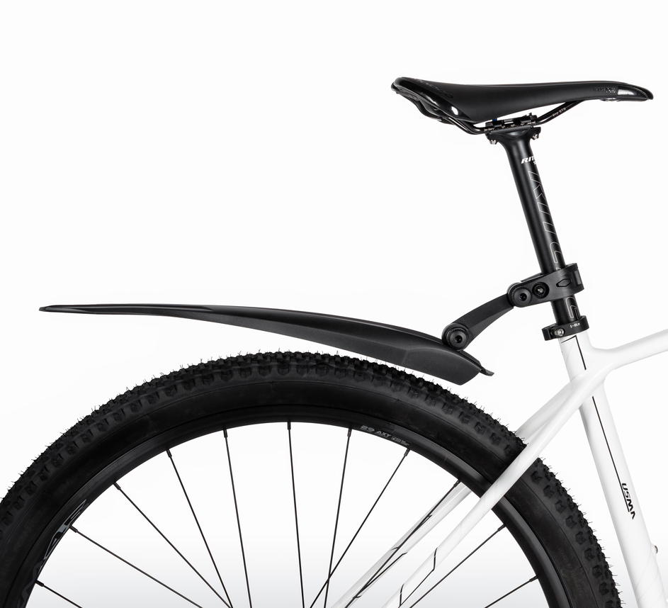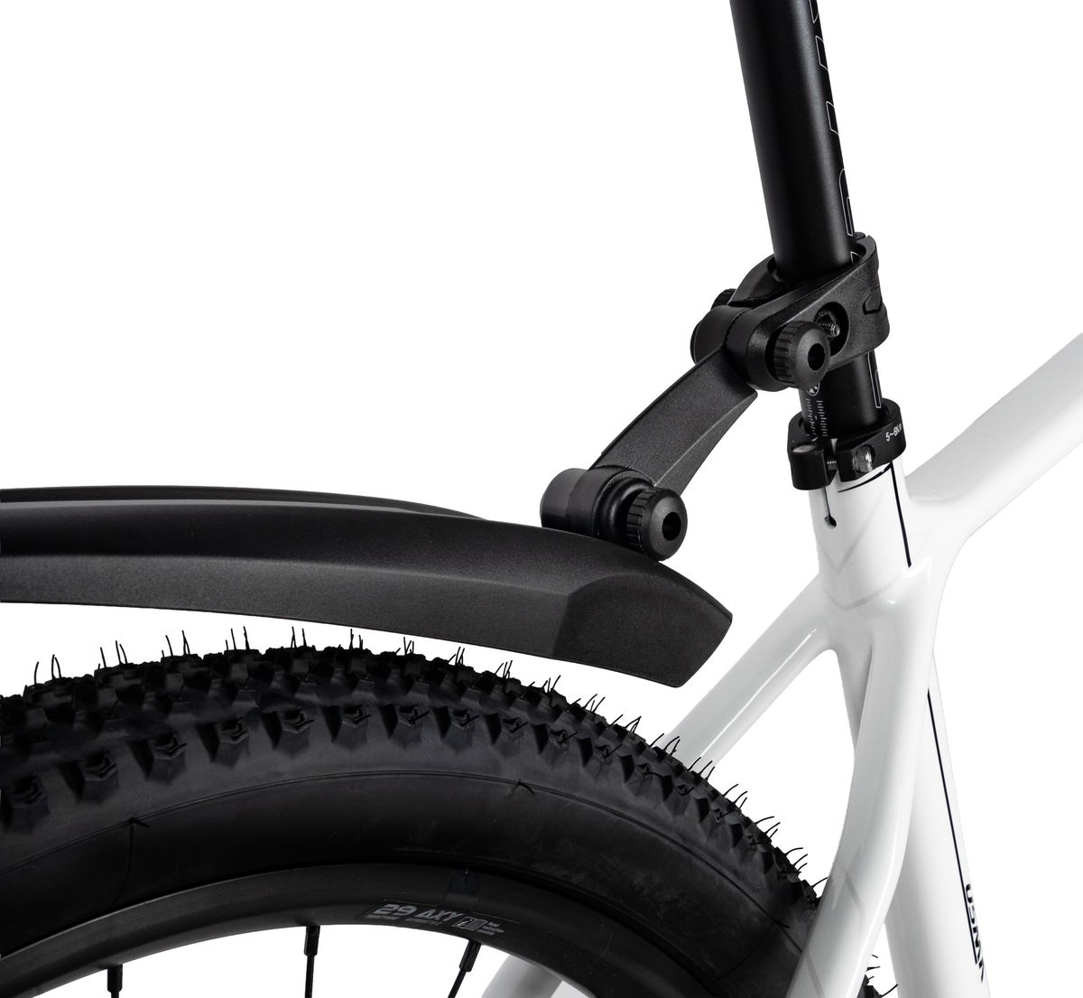 vhodné pro všechna kola 24" - 29" rozsah průměru sedlovky: 25,0 - 31,6 mm s gumovou vložkou nastavitelný úhel krytí délka blatníku: 59 cm (10cm držák) šířka blatníku: 80 mm hmotnost: 200 g materiál: plast, černý baleno v sáčku