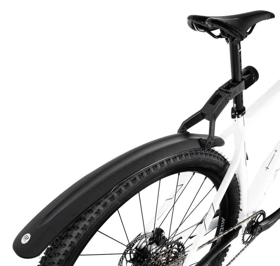 vhodný pro MTB 27,5" / 29" kola stažení kolečkem k sedlovce rozsah průměru sedlovky: 22 mm - 31,6 mm šířka blatníku: 80 mm materiál: plast, černé hmotnost: 260 g baleno v sáčku vyrobeno v Česku