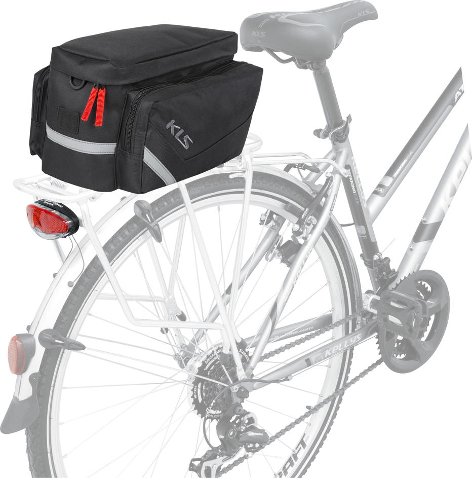 Brašna na zadní nosič KLS SPACE 12 je vyrobena z voděodolného materiálu Polyester 600D. Brašna má jednu hlavní část a dvě boční kapsy pro rychlý přístup. KLS SPACE 12 má objem 12 litrů a její součástí je odnímatelný ramenní popruh.