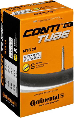 Kvalitní cyklo duše Continental pro 26 palcová horská kola. Rozměr: 26x1,75-2,5" (47-62/559) Ventilek: autoventil 40mm (AV) / dunlop 40mm (DV) galuskový 42mm (FV) / galuskový 60mm (FV)