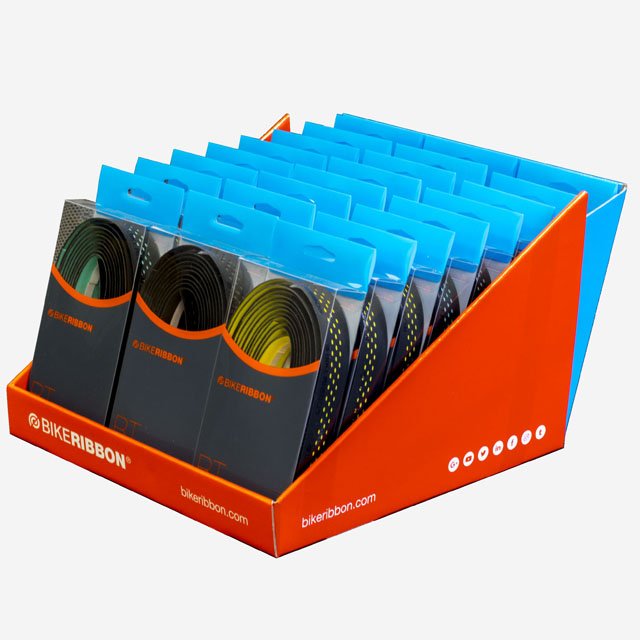 BIKERIBBON Display 24 je praktický prodejní stojan obsahující 24 omotávek ve třech nejpopulárnějších řadách značky Bikeribbon: Drops, Grip Evo a Cork Plus. Kombinace různých barev a materiálů osloví široké spektrum zákazníků – od silničních závodníků přes pohodové tour jezdce až po triatlonisty hledající výkon a komfort.