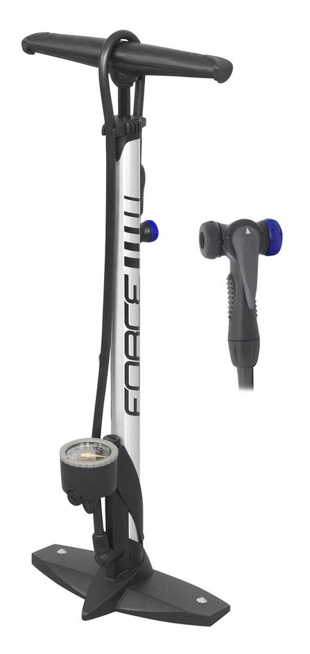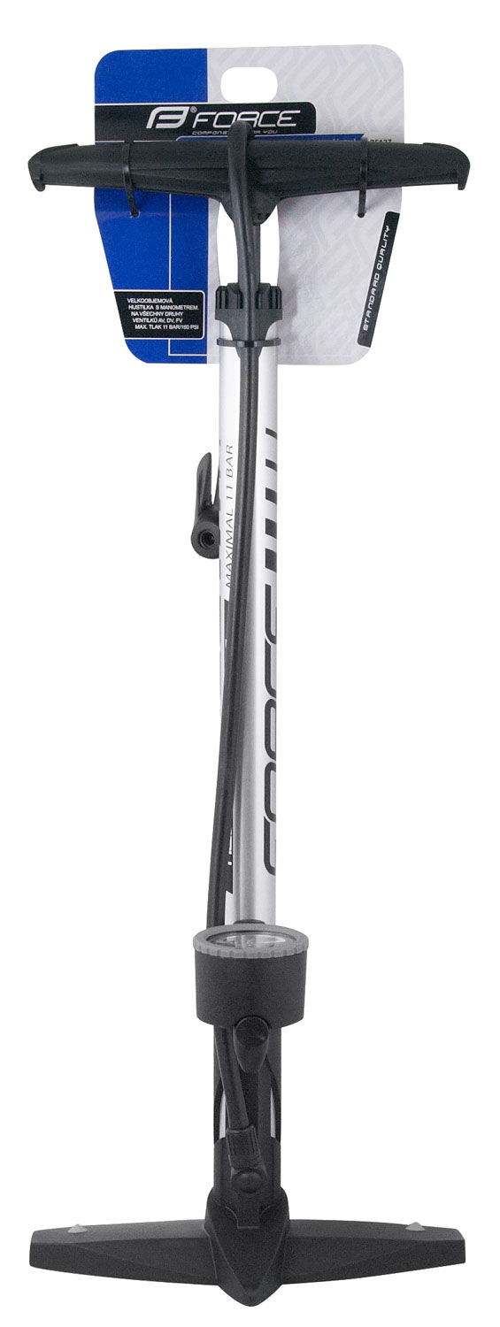 Al hliníková hustilka s plastovou spodní částí s oboustrannou hlavicí na všechny typy ventilků (AV - moto, FV - galuskový, DV - klasický) s manometrem do 160 PSI/ 11bar výška: 60 cm, hmotnost: 895 g určeno pro HOBBY použití baleno na kartě FORCE