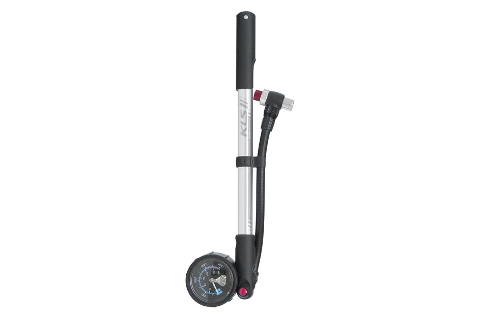 Pumpa pro vzduchové vidlice a tlumiče Tlakoměr Bar / psi Otočná hadička pro jednodušší tlakování Plastová ručka Hmotnost: 190g