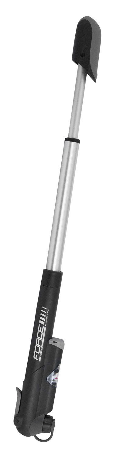 DUOPÍST na všechny druhy ventilků (AV - moto, FV - galuskový, DV - klasický) s manometrem, včetně držáku pod košík 100 PSI/ 7 bar délka: 20 cm materiál: plastové tělo, Al hliníkový píst hmotnost: 210 g baleno na kartě FORCE
