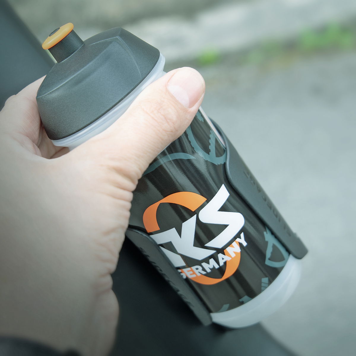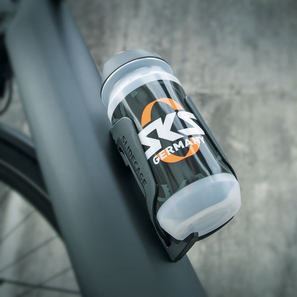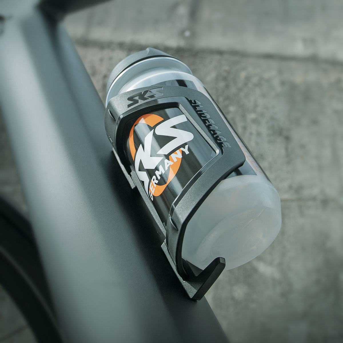 Po aktualizaci designu má držák na láhev SKS SLIDECAGE nový brilantní vzhled. Kromě přepracovaného háčku vytváří moderní vzhled zejména lesklé ražení na matném plastu.