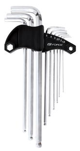 sada 9 ks TVRZENÝCH šestihranných klíčů: 1,5 / 2 / 2,5 / 3 / 4 / 5 / 6 / 8 / 10 mm s kuličkou na konci, v plastovém držáku materiál: nástrojová ocel Cr-V, chromovaná hmotnost: 430 g, baleno v blistru FORCE určeno k PROFI použití