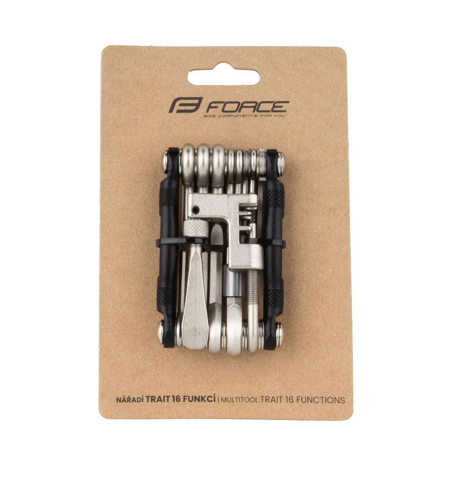 sada s 16 funkcemi obsahuje: 7 x šestihranný klíč- 2 / 2,5 / 3 / 4 / 5 / 6 mm + 8 mm adaptér nýtovač řetězu 7 -12 r. plochý šroubovák, 2 x křížový šroubovák - PH1/PH2 2 x klíč torx - T10/T25 čistící/zdrsňovací jehlu zaváděcí jehlu pro opravný knot montážní páčku délka: 85 mm, šířka: 50 mm, výška:…