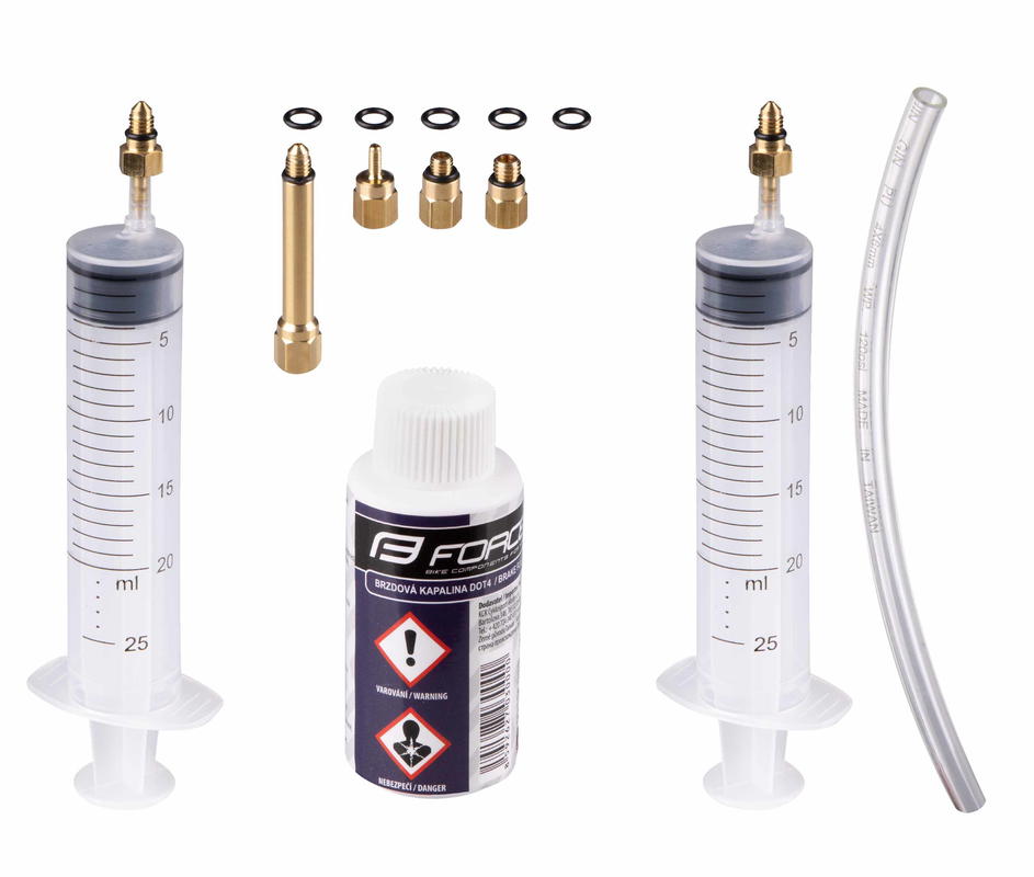 plnicí a odvzdušňovací sada pro hydraulické brzdy AVID a HAYES součástí balení: 2x stříkačka 1x hadička koncovky hadiček 50 ml kapaliny DOT4 baleno v sáčku