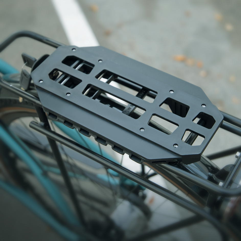 Adaptérová deska SKS MonkeyLoad. Mnoho kol jako Pegasus, Bulls, Kettler, Hercules nebo KTM je již standardně vybaveno nosičem zavazadel MonkeyLoad. Ale i stávající koše a tašky bez technologie MonkeyLoad lze snadno přeměnit. Desku adaptéru lze připevnit ke spodní straně tašky pomocí šroubů, díky čemuž je taška vhodná pro systém ML.