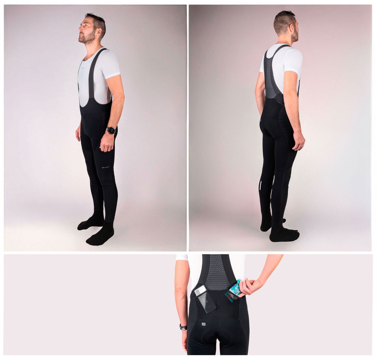 kalhoty s vložkou speciálně vyvinutá dvouvrstvá vložka FORCE přední panel z neprofukového materiálu a podčesaný zadní panel zateplená lycra (fleece) kapsa na zadní straně na bedrech reflexní prvky elastické šráky, zadní část ze síťoviny pro lepší prodyšnost určení pro teploty v rozmezí 0 °C až +10…