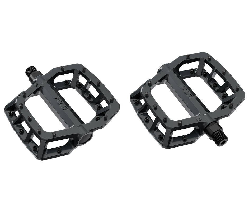 Platformové pedály KLS FLAT 50 023 mají ergonomický tvar, který poskytuje dobrou přilnavost a zároveň minimalizuje hmotnost těla pedálu. Tělo pedálu je odlito z hliníkové slitiny, díky čemuž je robustní a relativně lehké. CNC opracovaná Cr-Mo oska v kombinaci s ekonomickými kuličkovými ložisky zajišťuje plynulé šlapání i v těch nejdrsnějších podmínkách. Konkávně tvarované tělo pedálu s 10 piny umístěnými na každé straně pedálu poskytuje grip i v nejostřejších zatáčkách při jízdě v bikeparcích a na nejtěžších trailech.