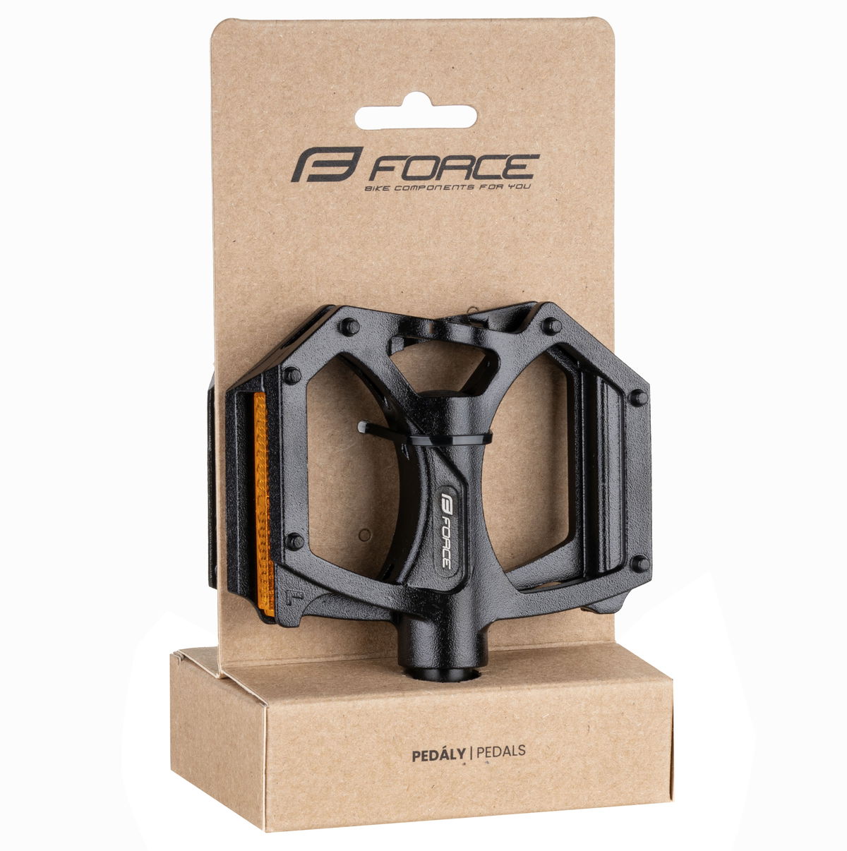 kuličková ložiska, s odrazkami protiskluzová úprava s piny materiál: tělo pedálu hliník, osa Cr-Mo velikost platformy: 100x100x27 mm hmotnost 1 páru: 335 g baleno na kartě FORCE