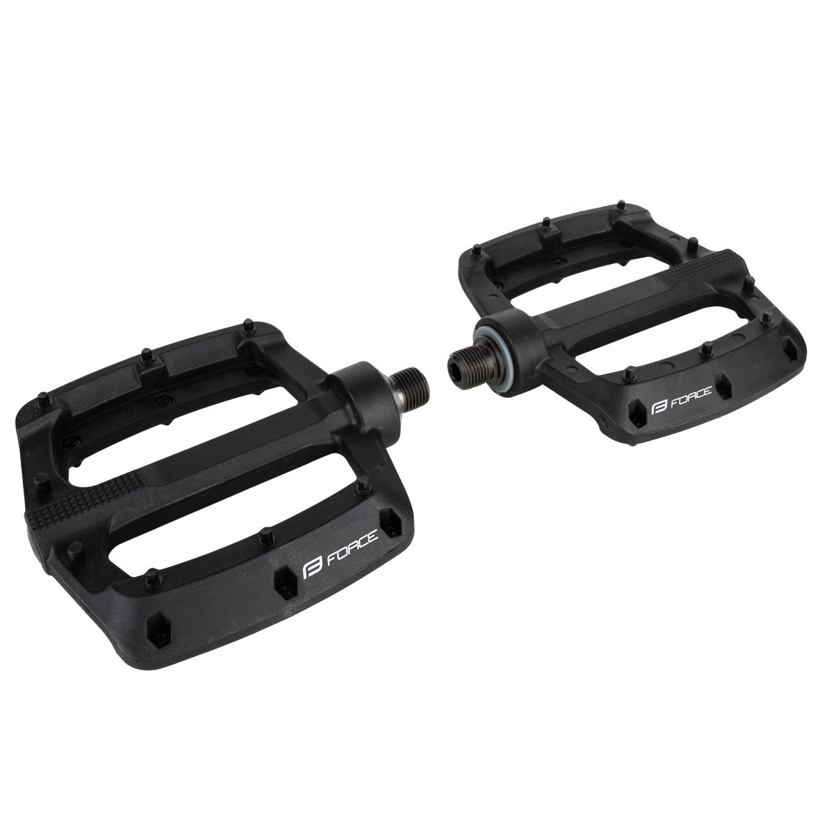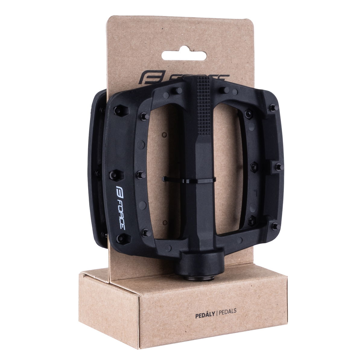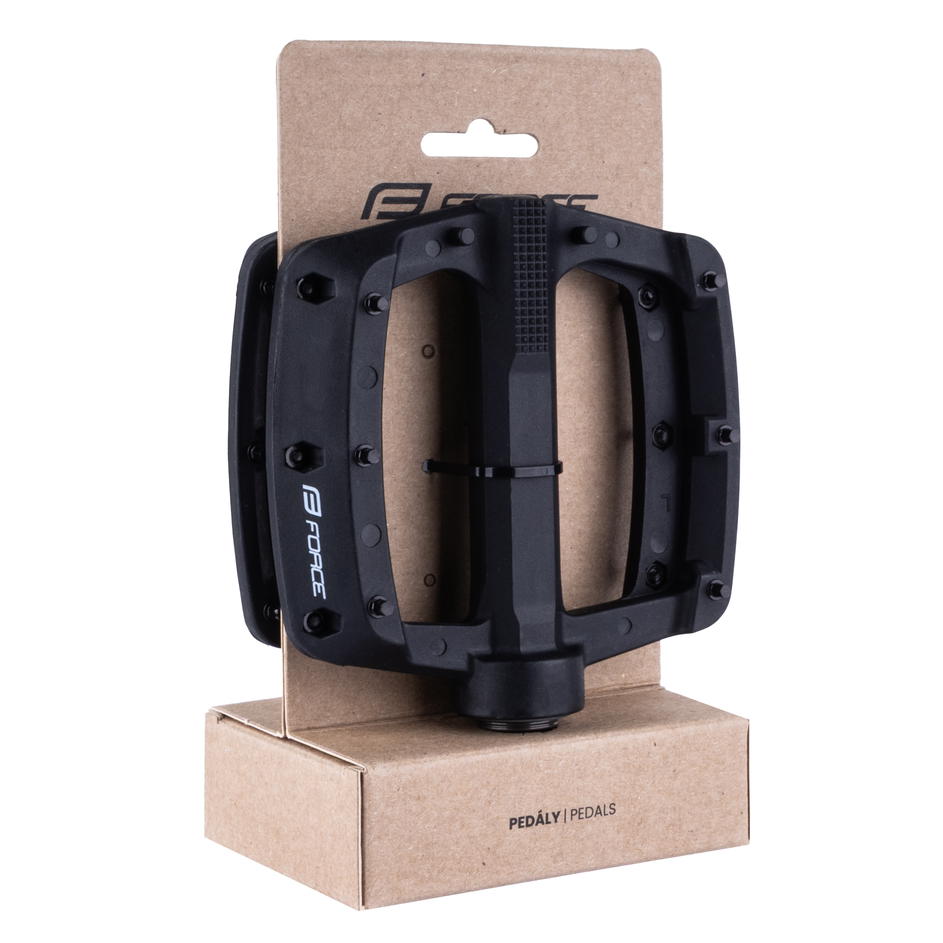 pedály nylonové 3 průmyslová ložiska 1x větší ložisko blíže klice + 2 menší ložiska u prachovky výměnné piny velikost platformy: 103x103 mm hmotnost 1 páru: 349 g baleno na kartě FORCE