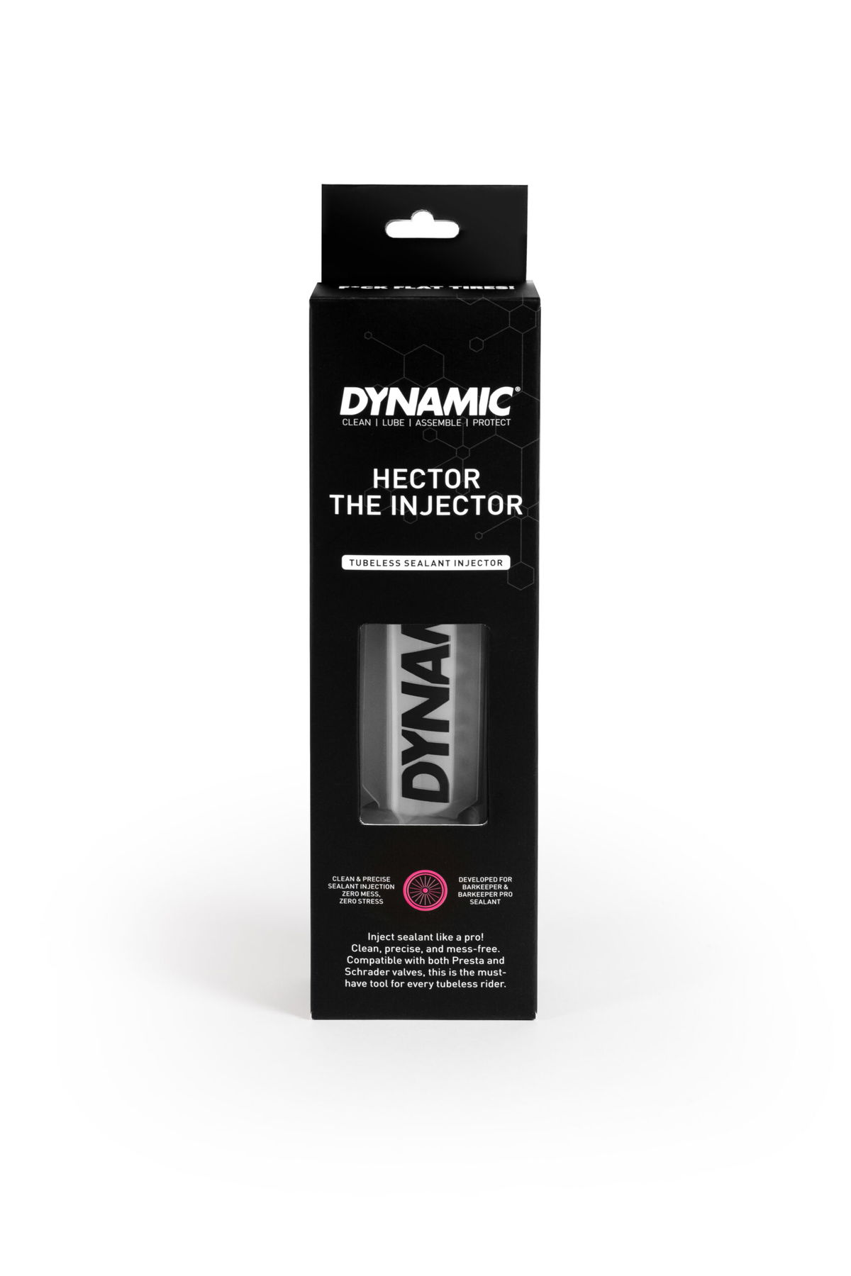 Díky širokému adaptéru je ideální pro použití i s hustým tmelem Barkeeper Pro, který jiné injektory snadno ucpe. Kapacita 100 ml s přesnou měrkou umožní přesné dávkování podle typu kola a šroubovací adaptér na ventil zajistí kontrolu i čistotu při aplikaci. Kompatibilní s ventily Presta i Schrader, Hector The Injector je spolehlivý pomocník pro každé tubeless kolo.