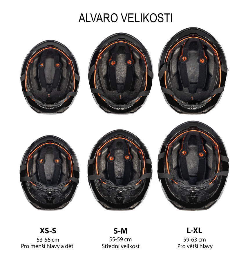 Přilba ALVARO je k dispozici ve třech velikostech: XS-S (53-56 cm), S-M (55-59 cm) a L-XL (59-63 cm), což zaručuje perfektní fit pro širokou škálu velikostí hlavy.