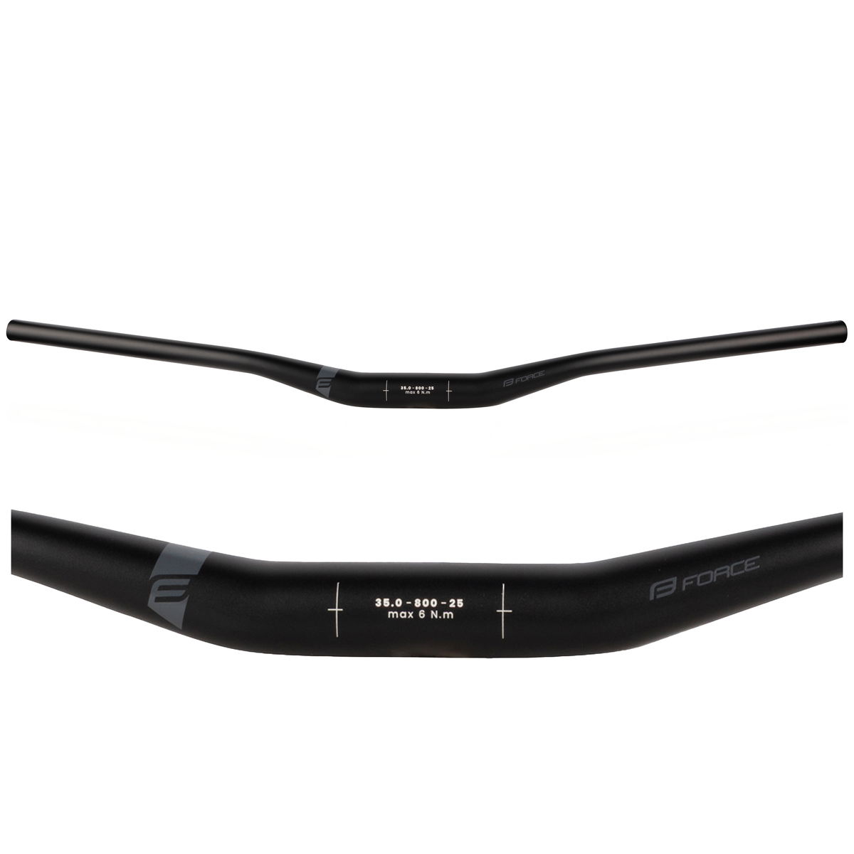 průměr řidítek pro představec: 35,0 mm šířka: 800 mm zdvih: 25 mm (osa - osa) zahnutí vzad: 7° zahnutí vzhůru: 5° materiál: Al 7075, černý matný hmotnost: 357 g baleno na kartě FORCE