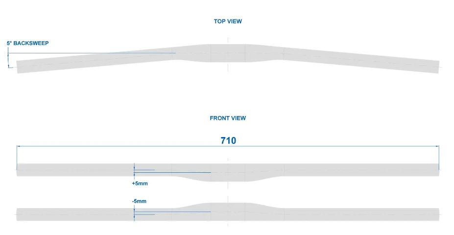 MTB XC sportovní řídítka, šířka 710 mm, zahnutí 5 stupňů, matná povrchová úprava, hmotnost 276 g.