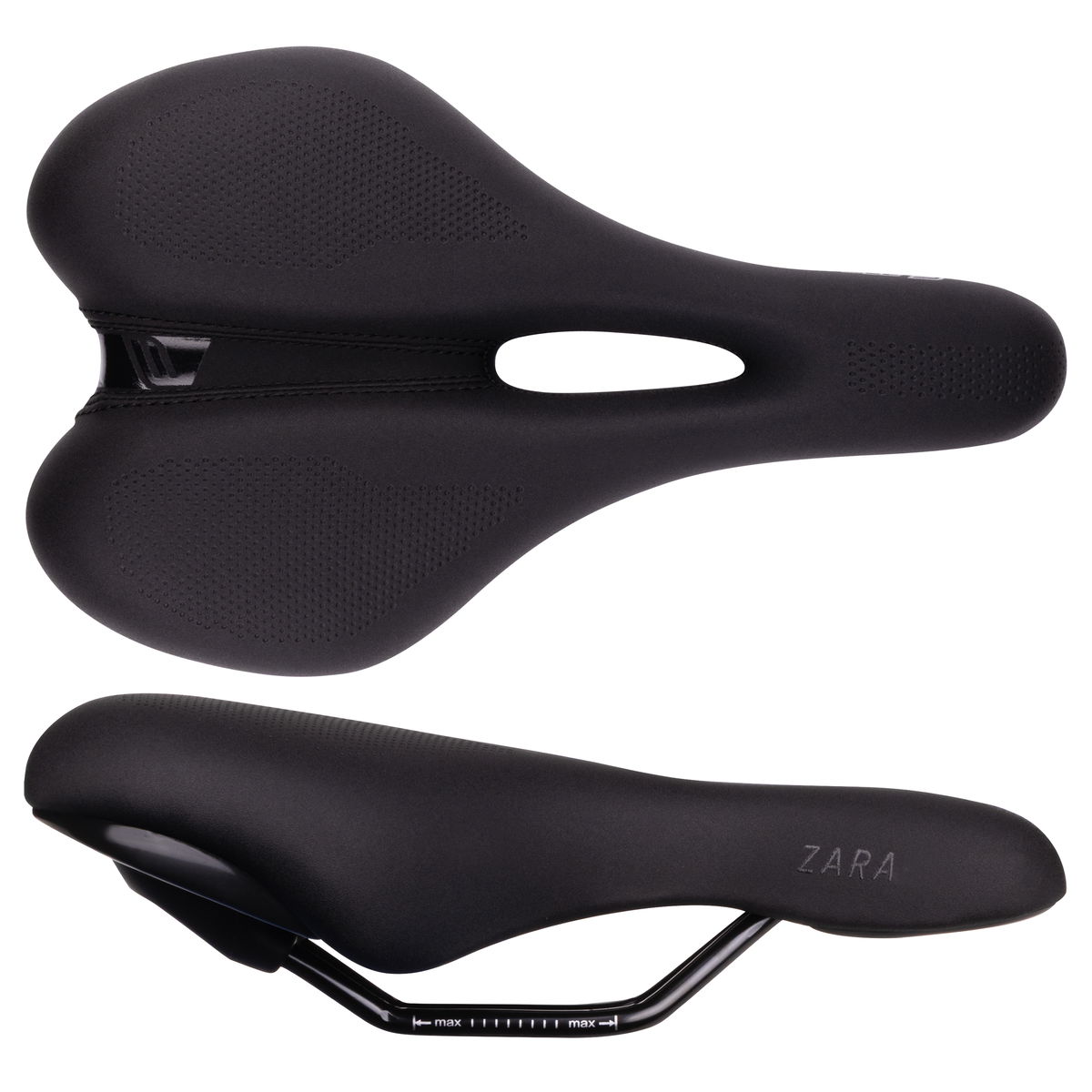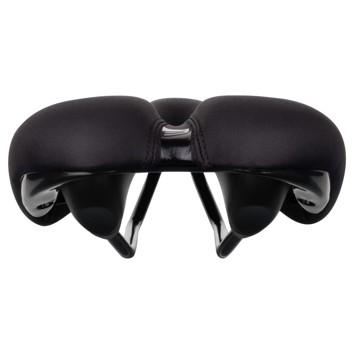 Pohodlné širší sedlo ploššího tvaru vhodné například na cykloturistiku a na městská kola. Disponuje vysokou a měkkou vrstvou polstrování na nylonové konstrukci s výrazným podélným otvorem pro snížení tlaku v citlivých místech pro zajištění jízdního komfortu po dlouhou dobu. bez podsedlového zámku…