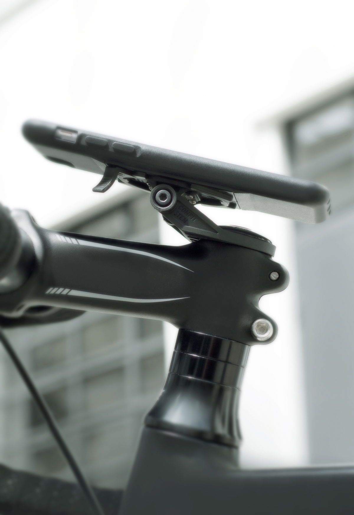 Vysoce kvalitní držák smartphonu je namontován pod stávající krytkou ježka na představci. Díky bajonetovému držáku lze mobilní telefon namontovat rychle a snadno jediným pootočením - v obou směrech. To znamená, že kokpit zůstává čistý a řídítka zůstávají volná. Držák mobilního telefonu s uchycením na představec také poskytuje ideální řešení pro použití systému COMPIT pro MTB kola a elektrokola s 35 mm řídítky. Má nastavitelný úhel.
