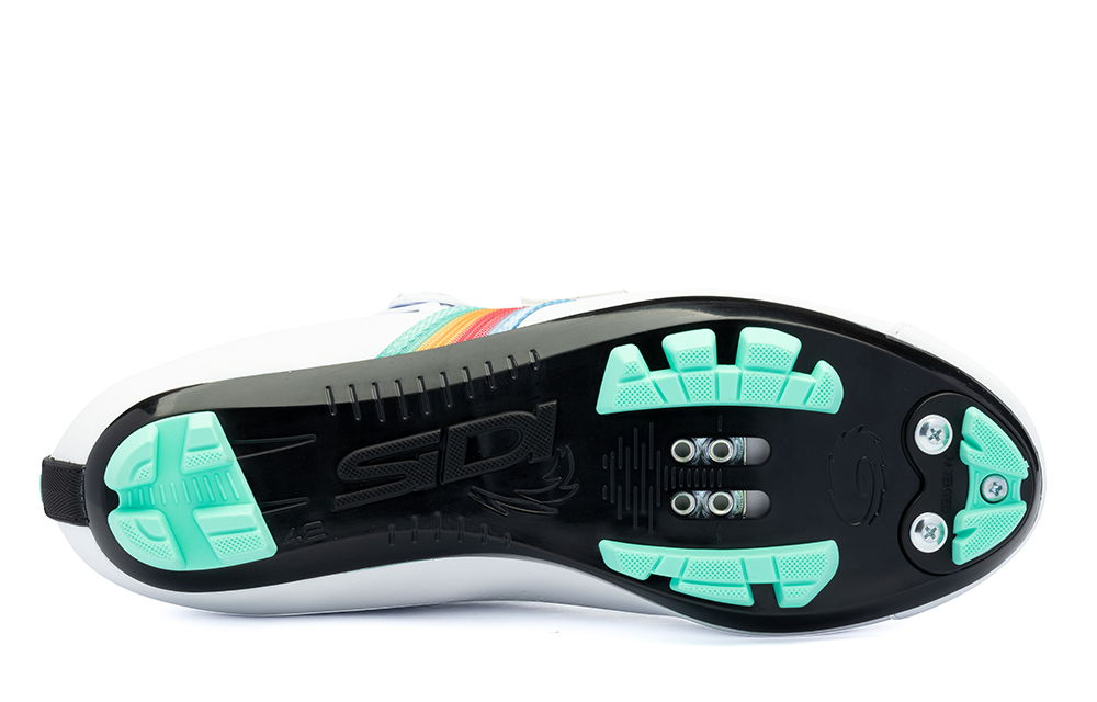 Nylonová MTB podrážka je doplněna o vyměnitelné gumové vložky pro maximální trakci a komfort při chůzi. Integrované chrániče špičky zvyšují odolnost proti nárazům a chrání nohu při jízdě v náročném terénu.