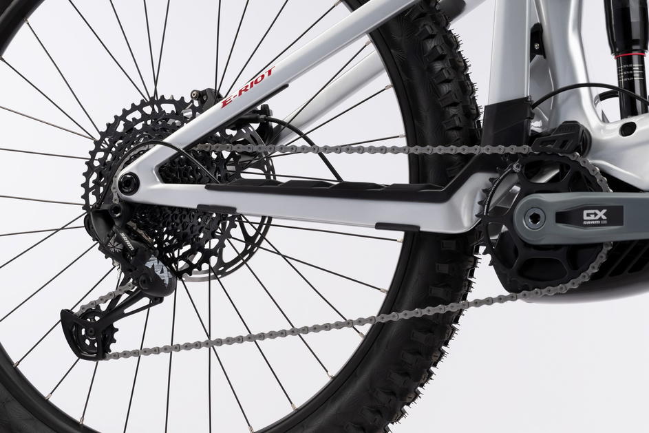 Každá verze E-RIOTu přichází s propracovanými detaily, které posouvají zážitek z jízdy na novou úroveň. Mezi ně patří systém přepákování Tractionlink 2.0 pro optimální trakci a odpružení, pevná, jednodílná zadní stavba z karbonu a koncept VPP (Virtual Pivot Point), který zajišťuje citlivější odezvu a lepší podporu ve středu zdvihu. Design odpružení s virtuálním otočným bodem (VPP) využívá systém přepákování, který vytváří „virtuální“ otočný bod pohybující se při kompresi odpružení, což optimalizuje dráhu zadního kola a efektivitu šlapání. Na rozdíl od konstrukcí s jedním otočným bodem umožňuje VPP zadnímu kolu následovat zpočátku dráhu nahoru a dozadu, což zlepšuje překonávání překážek, pohlcování nárazů a zajišťuje lepší trakci. Tento design zvyšuje stabilitu a kontrolu, snižuje zpětný ráz při šlapání (kickback) a je ideální pro technický terén. Mullet konfigurace, v kombinaci s novou vidlicí Rock Shox Zeb 3.1 nebo Fox 38 Grip X2 a plášti Continental Kryptotal, zajišťují, že E-RIOT zůstává sebejistý i v nejtvrdším terénu.