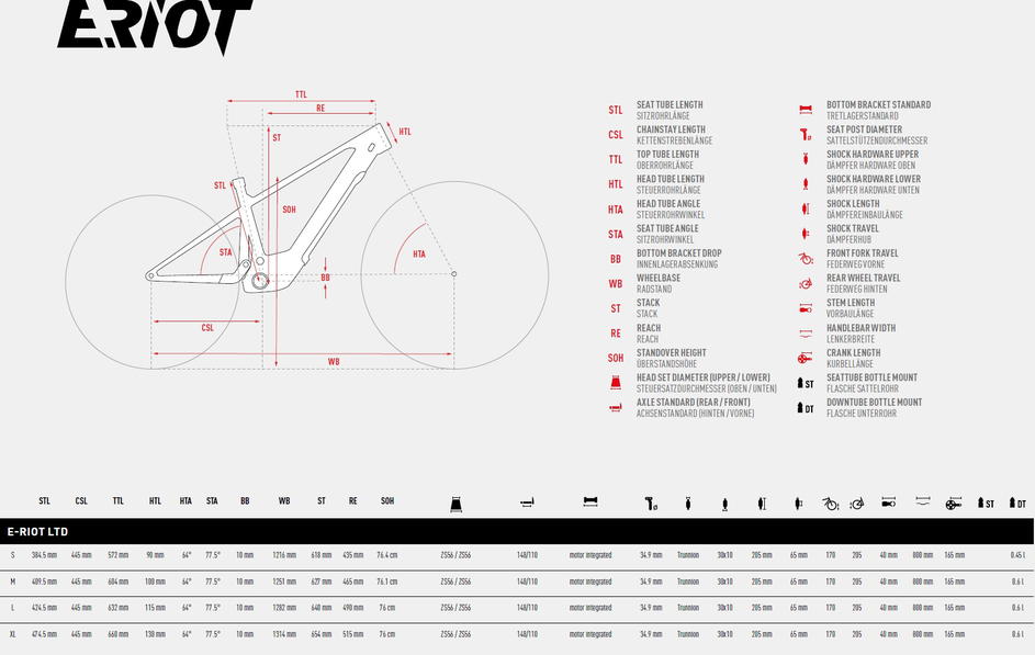 - E-RIOT LTD: exkluzivní verze s prvotřídním vybavením jako jsou komponenty SRAM/RockShox, DT Swiss karbonové ráfky, doplňky Truvativ, 220mm kotouče vpředu i vzadu a bezdušové pláště včetně PTN vložek do plášťů