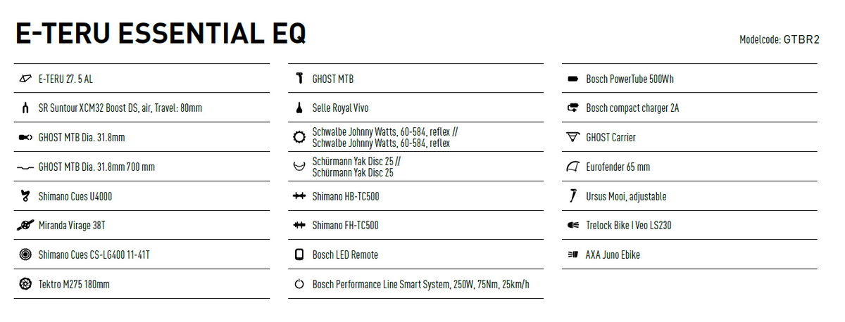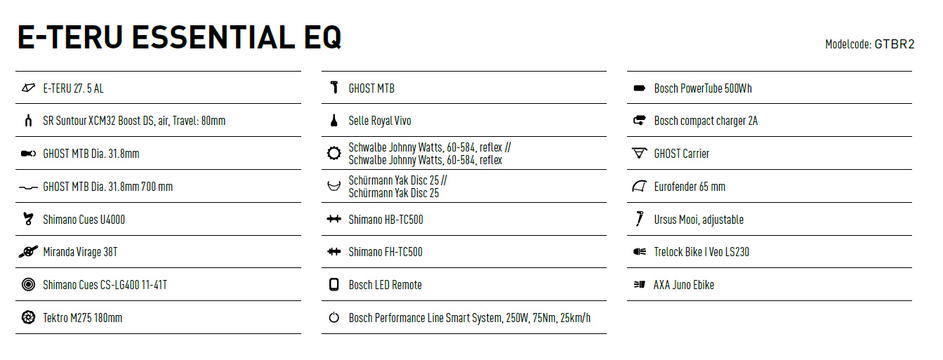 Vyladěná kombinace propracovaného designu, výkonného motoru Bosch Performance, vidlice SR Suntour XCM32 a 27,5palcová kola vám zajistí bezproblémové zdolání jakéhokoli terénu. Ghost E-Teru Essential je jednoduše parťák do nepohody, na kterého se můžete spolehnout. Během jízdy můžete měnit režimy asistence podle toho, jak velkou přípomoc zrovna budete potřebovat. Veškeré jízdní údaje jako jsou vzdálenost, rychlost, stav nabití baterie nebo stupeň asistence se zobrazují na dobře čitelném LED displeji. O bezproblémový chod jízdy se stará řazení Shimano CUES s 1x9 převody a o perfektní brzdný účinek spolehlivé Tektro HD-M275. Model EQ má navíc v základní výbavě praktický nosič, stojan, blatníky a přední a zadní světlo. Stačí nasednou a vydat se vstříc novým zážitkům!