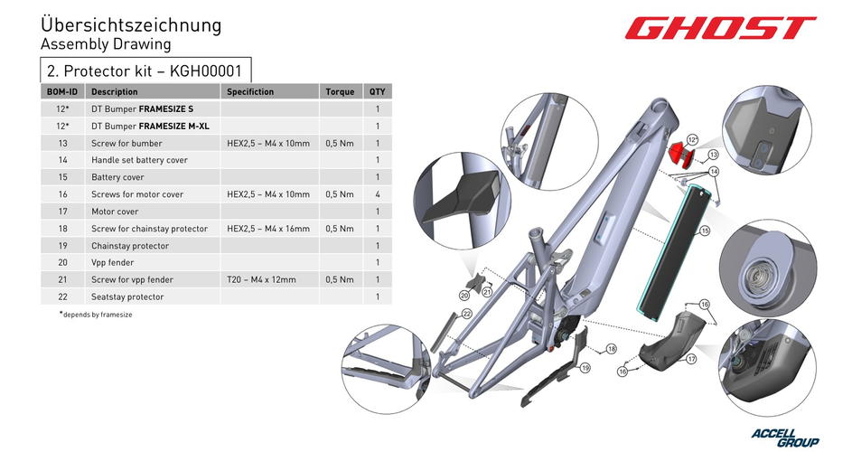 12* DT Bumper FRAMESIZE S 1 12* DT Bumper FRAMESIZE M-XL 1 13 Screw for bumber HEX2,5 – M4 x 10mm 0,5 Nm 1 14 Handle set battery cover 1 15 Battery cover 1 16 Screws for motor cover HEX2,5 – M4 x 10mm 0,5 Nm 4 17 Motor cover 1 18 Screw for chainstay protector HEX2,5 – M4 x 16mm 0,5 Nm 1 19…
