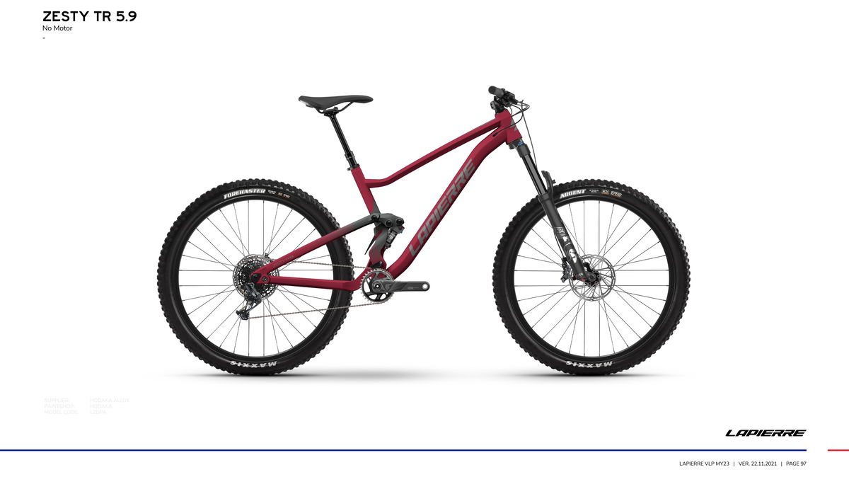 LAPIERRE Zesty TR 5.9 přináší unikátní spojení celoodpruženého XC stroje a enduro biku. Kolo nabízí všem typům jezdců ideální geometrii a vhodně zvolené komponenty. Model je osazen lehkým a pevným hliníkovým rámem ze slitiny Supreme 5, 12rychlostním řazením SRAM NX Eagle a špičkovými čtyřpístkovými brzdami SRAM G2. Samozřejmostí je teleskopická sedlovka, která usnadňuje sjezdové pasáže a dává jezdci větší prostor pro pohyb nad bikem. Zesty TR byl vyvinut s pomocí profesionálních jezdců, jejichž zkušenosti se promítly do výsledné podoby tohoto výjimečného stroje.