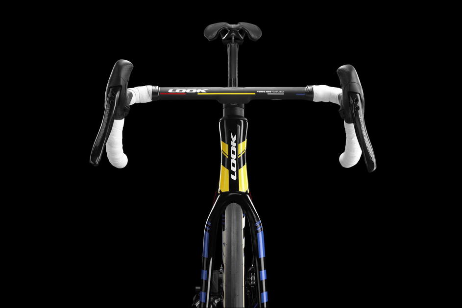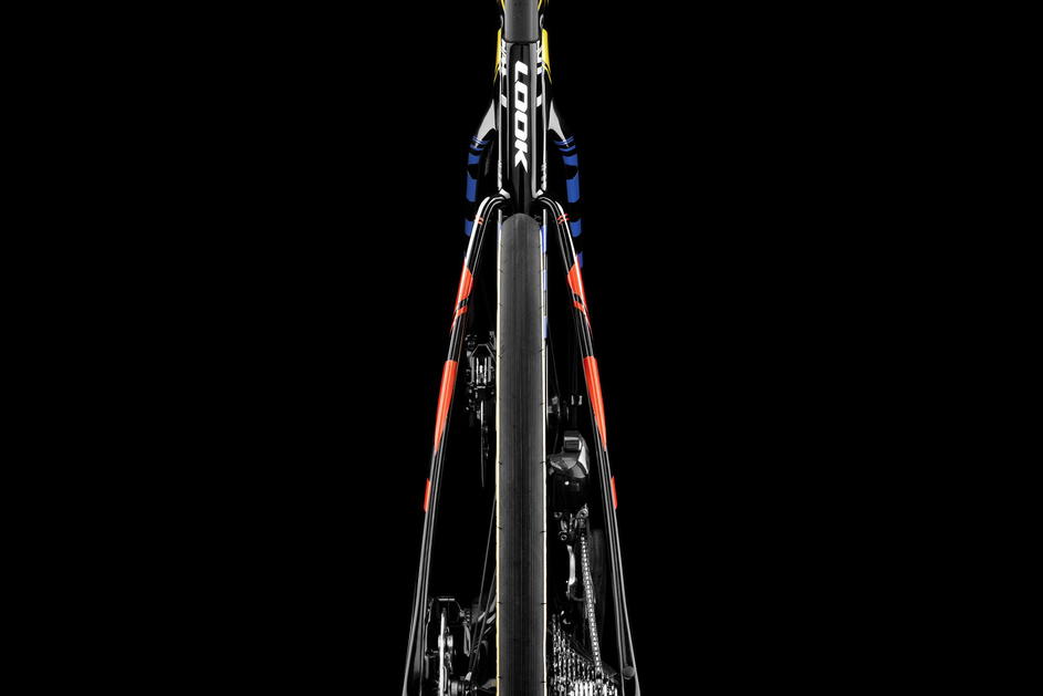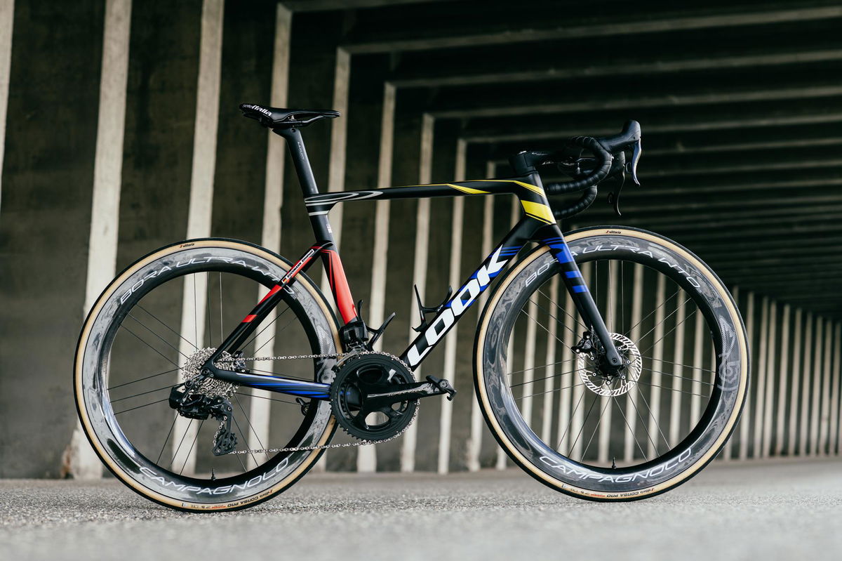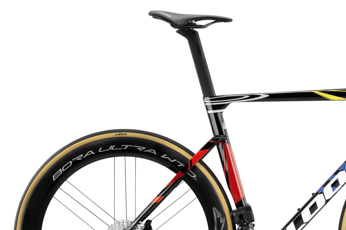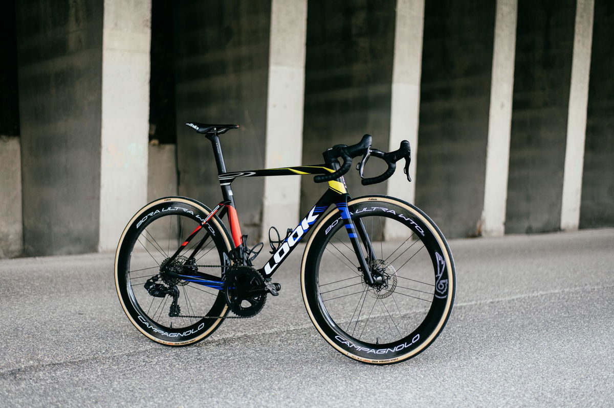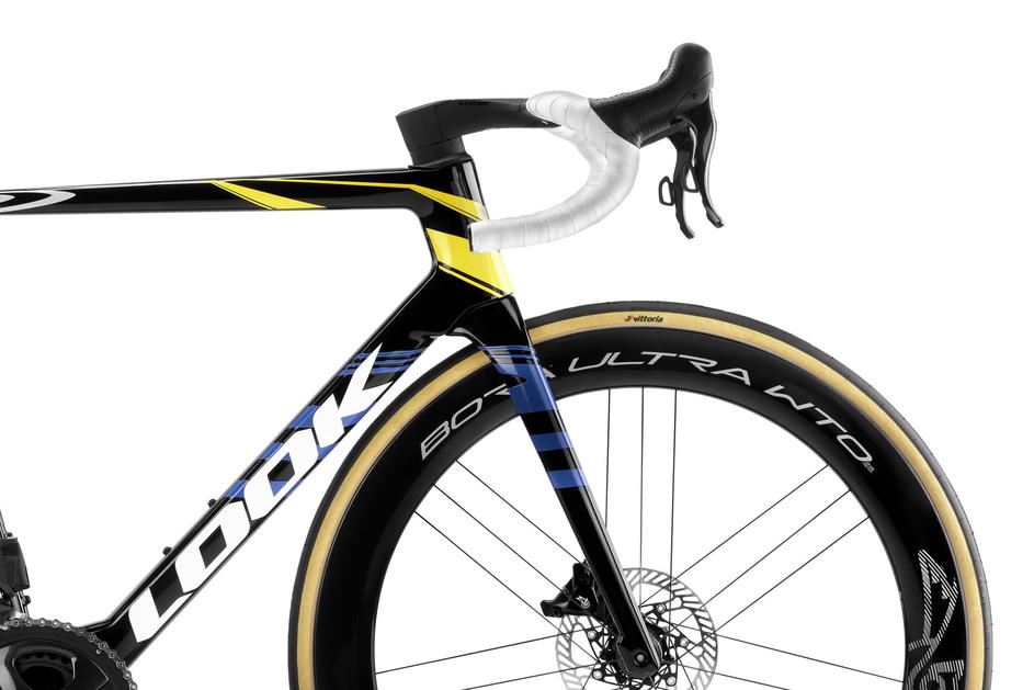 O perfektní přenos výkonu a aerodynamiku se starají karbonová kola Campagnolo Bora Ultra WTO 60 Team Edition ve speciální závodní barevné úpravě, obutá do plášťů Vittoria Corsa Pro. Kombinace, kterou ocení každý, kdo jede na hraně. Čistě černý lak ušetří 40 gramů a nechává vyniknout ikonickým barevným akcentům inspirovaným Mondrianovým stylem, který je pro značku LOOK typický.