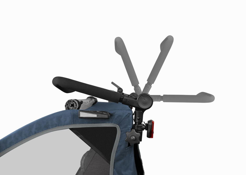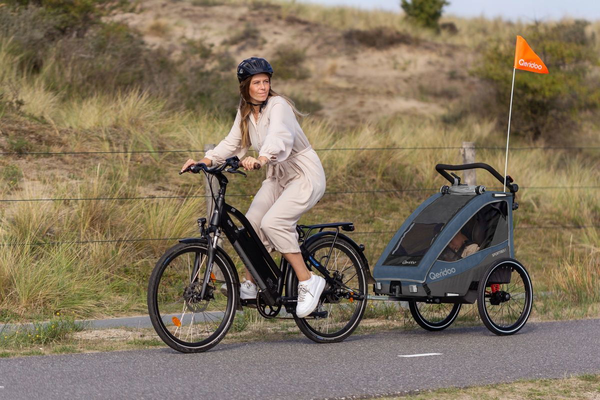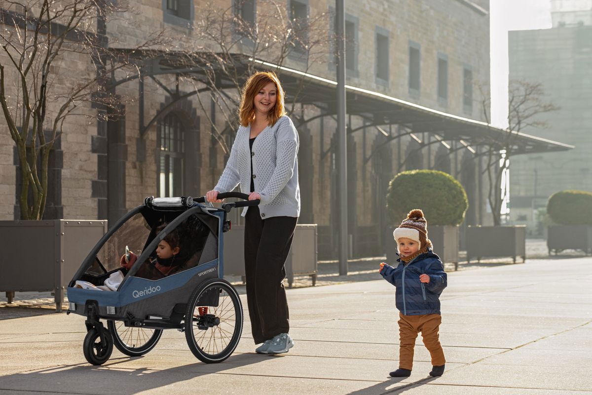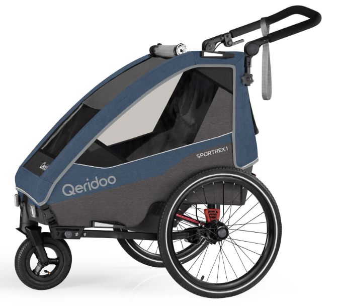 Jednomístný odpružený dětský vozík za kolo Qeridoo Sportrex 1. KOMFORT: Komfortní sedadlo s adaptivním 5-bodovým pásem. Multiwheel – kočárkové kolečko s funkcí jogger (aretace) Výškově nastavitelná tlačná rukojeť s ochranou při převrácení Střešní kryt 3v1 (ochrana proti hmyzu, ochrana proti slunci…