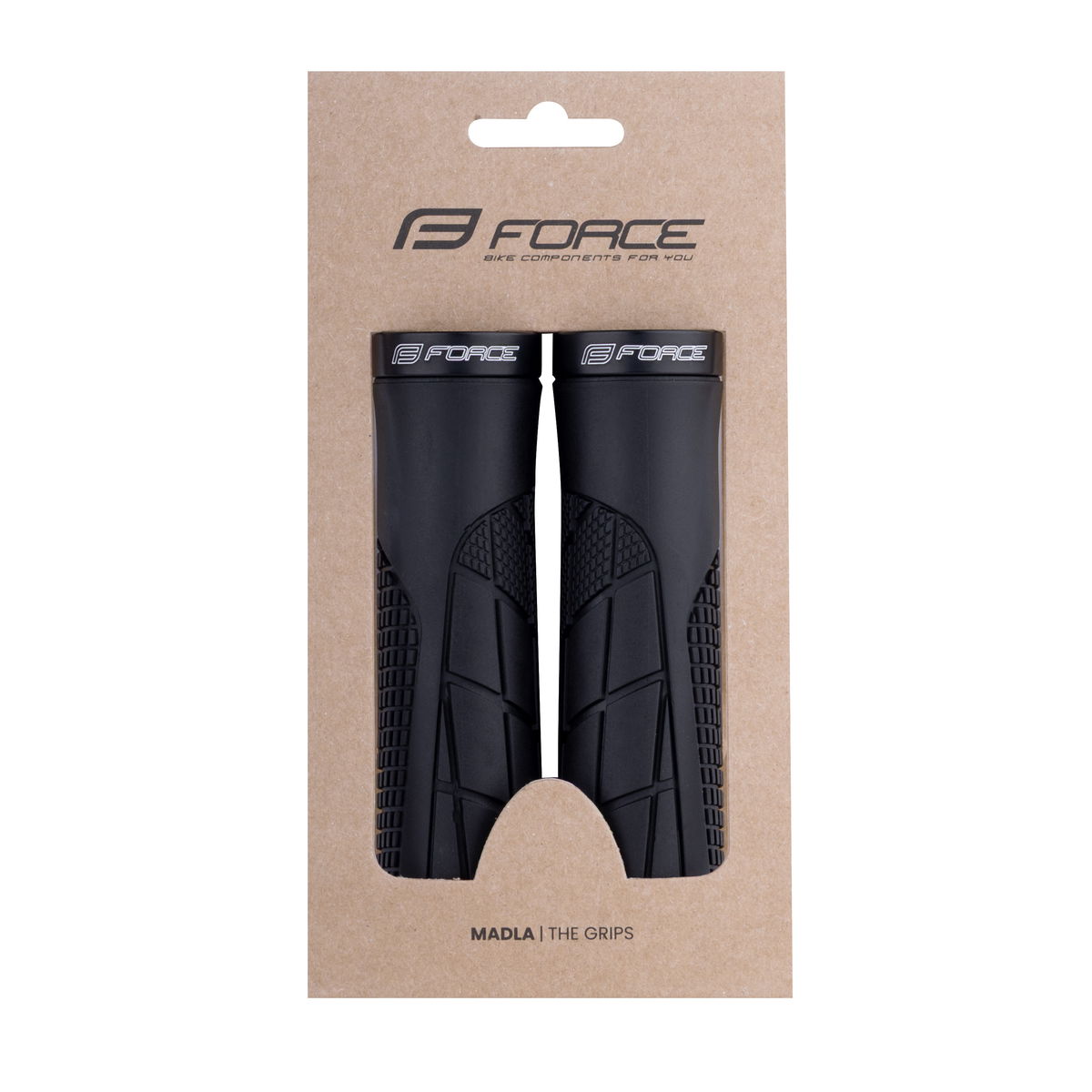 gumová madla, uzavřená, jištěná vnitřní průměr: 22,2 mm délka: 130 mm hmotnost 1 páru: 128 g baleno na kartě FORCE