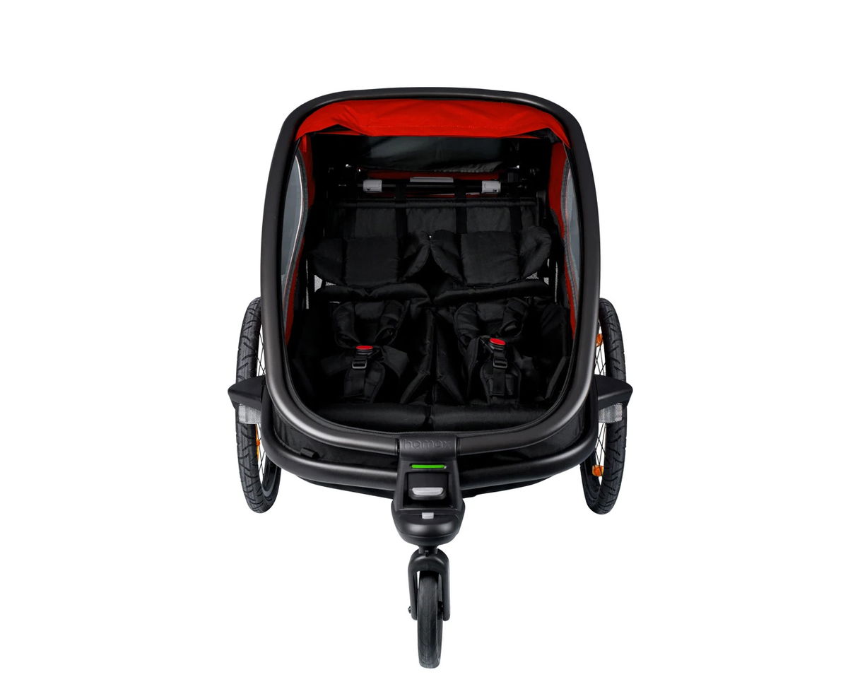 Dvoumístný dětský vozík HAMAX Outback je odolný a pohodlný cyklistický vozík pro aktivní rodiny. Vyniká pevnou konstrukcí, promyšlenou ergonomií a snadným ovládáním, díky čemuž zvládne městské cyklojízdy i delší výlety po zpevněných cestách. Velká okna nabízejí skvělý výhled, větrací panely zlepšují cirkulaci vzduchu a praktické prvky usnadňují každodenní používání.