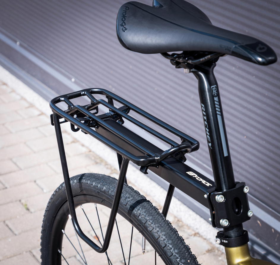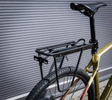 univerzální pro jízdní kola 24" - 26" - 28" - 29" pro průměr sedlové trubky 25,0 - 31,6 mm uchycení na sedlovce pomocí 4 šroubů rozměry horního nosného dílu: délka: 32 cm, šířka: 11 cm se zadním držákem pro uchycení blikačky materiál: hliník nosnost: 10 kg hmotnost: 660 g baleno sáčku