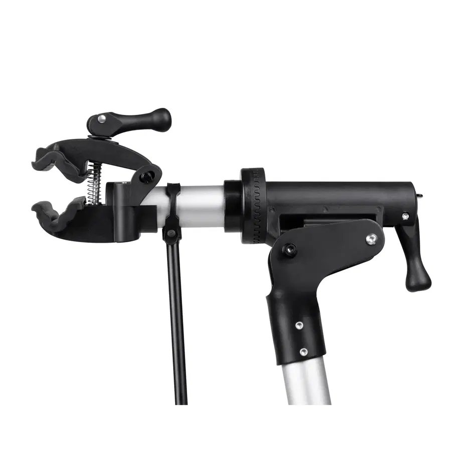 rozkládací stavitelný montážní stojan dvojnožka, s poličkou a držákem přední vidlice 360° otočná horní čelist pro průměr trubky max 40 mm materiál: hliník výška ve složeném stavu: 100-159 cm hmotnost: 4,5 kg nosnost: do 30 kg určeno pro HOBBY použití